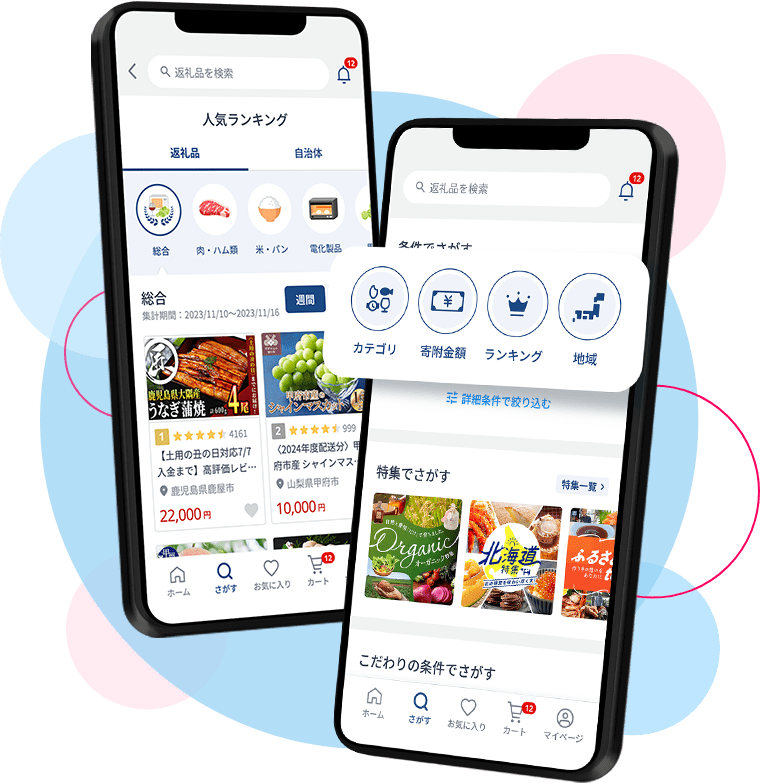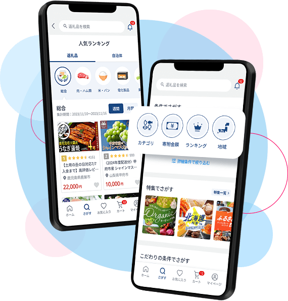 こだわり条件で返礼品を探したり、カテゴリごとのランキングで人気の返礼品も簡単に見つけられるようになりました。 -