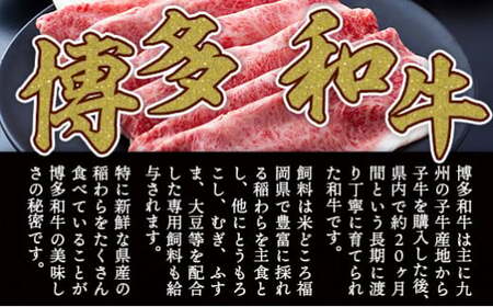 福岡の上質な黒毛和牛【博多和牛】のしゃぶしゃぶすき焼き用です!博多和牛は主に九州の子牛産地から子牛を購入した後、県内で約20ヶ月間という長期に渡り丁寧に育てられた和牛です。