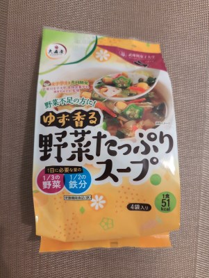 キャベツ・ほうれん草・にんじん・コーン・れんこん・オクラの6種類の野菜とゆず・大豆フレークが入った、具沢山なゆず風味の和風スープです。