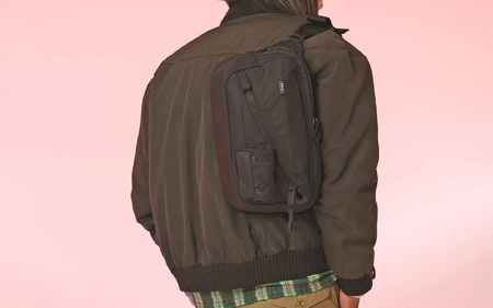 フロントに流れる無骨な金属ファスナーを使用したポケットとワイヤレスイヤホンサイズのフラップポケットが コレクション共通のデザインになります。