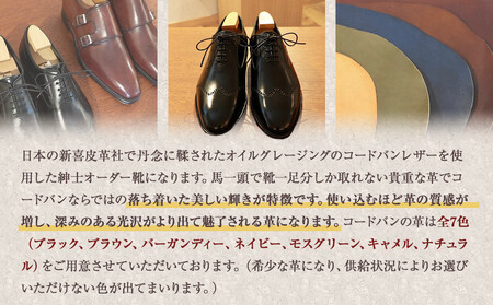 日本の新喜皮革社で丹念に鞣されたオイルグレージングのコードバンレザーを使用した紳士オーダー靴になります。コードバンならではの落ち着いた美しい輝きが特徴で、使い込むほど革の質感が増し、深みのある光沢がより出て魅了される革になります。