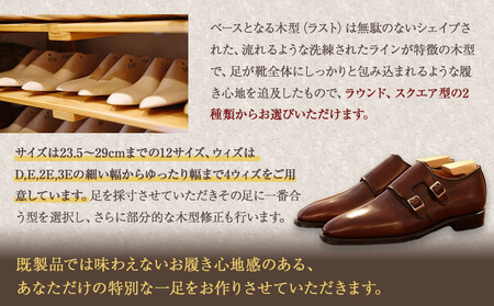 サイズは23.5~29cmまでの12サイズ、ウィズはD,E,2E,3Eの細い幅からゆったり幅まで4ウィズをご用意しています。足を採寸させていただきその足に一番合う型を選択し、さらに部分的な木型修正も行いますので、既製品では味わえないお履き心地感のある、あなただけの特別な一足をお作りさせていただきます。