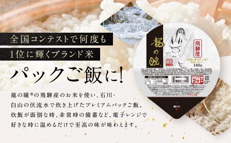 龍の瞳の飛騨高山産のお米を用い、石川・白山の伏流水で炊き上げたプレミアムパックご飯。炊飯が面倒なときに、非常時の備蓄に、美味しくいただけます。