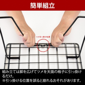 簡単組立:組み立ては脚を広げてツメを天面の格子に引っ掛けるだけ。