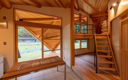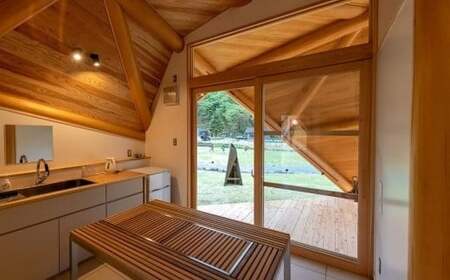 テントに近い使い方をしていただけるよう、リビング部分はテラコッタ調のタイル張りにし、土足のまま屋外デッキなどへの移動もスムーズに行える仕様にいたしました。