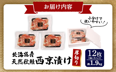 北海道産 厚切り天然鮭 西京漬け 約1.9kg | 4枚 3パック 秋鮭 味噌漬け さっぱり 旨味身 脂控えめ 焼き魚 小骨取り 手作業 加工 鮭 切り身 魚料理 弁当 おかず 夕食 惣菜 和食 安心 食べやすい 冷凍 保存 お取り寄せ ワンストップ マイページ マリナシーフーズ 羽幌町