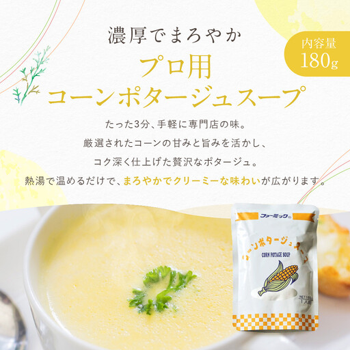 熱湯で3分間温めるだけ!!ご家庭で手軽にプロの味が楽しめるコーンポタージュスープです。厳選されたコーンを使用し、コクがあるのに、まろやかな味に仕上げました。