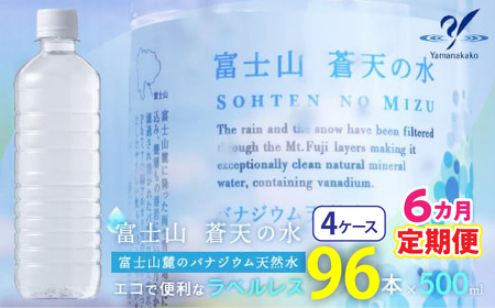 【6カ月定期便】<ラベルレス>富士山蒼天の水 500ml×96本 (4ケース) YC004 | ミネラルウォーター 国産 人気 水 蒼天 蒼天の水 山中湖村 山中湖 富士山 バナジウム ミネラルウォーター 国産 人気 水 蒼天 蒼天の水 山中湖村 山中湖 富士山 バナジウム