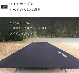 NAPは一般的な1人用コットよりもワイドサイズにデザインされており、アウトドアシーンでも十分な休息が取れるよう設計されています。