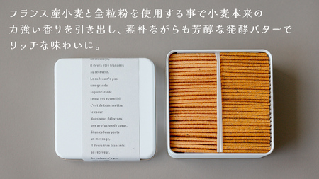 フランス産小麦と全粒粉を使用する事で小麦本来の力強い香りを引き出し、素朴ながらも芳醇な発酵バターでリッチな味わいに。