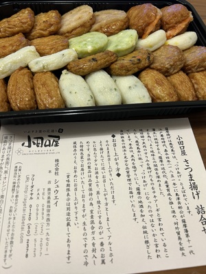 さつま揚げ:魚肉(イトヨリダイ、とび魚、アジ、その他)、さつま芋、でん粉、ごぼう、砂糖、米発酵調味料、卵白、チーズ、キャベツ、れんこん、食塩、灰持酒(薩摩地酒)、豆腐、玉ねぎ、人参、山芋、黒ごま、大葉、菜種油、調味料(アミノ酸等)、保存料(ソルビン酸(K))
