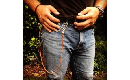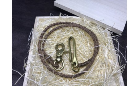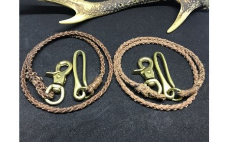 真鍮製のフックをベルトやベルトループに引っ掛けて使うことができ、チェーン部は丈夫な背中の革を編み込んで作成しています。