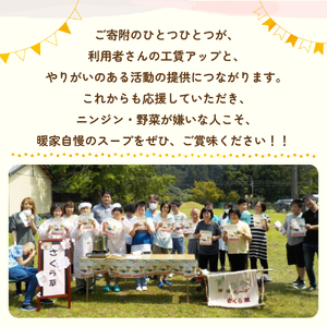 利用者さんの工賃アップと、やりがいのある活動を提供するために、試行錯誤しながらやっと自慢のスープが完成しました!