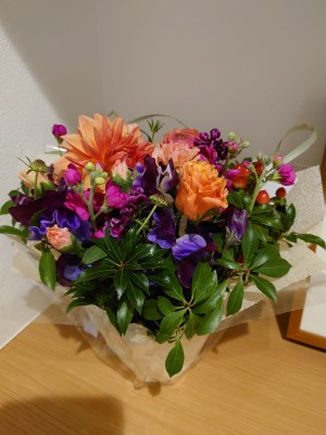 生花のアレンジメントとあって、宅配が少し心配でしたが、まずは第一回目 とても可愛らしいアレンジメントが無事届きました! 小さな家にはちょうどいい大きさで、部屋がパッと華やぎました。アレンジメントなのでなるべく長持ちしてほしいので毎日お水をあげます!