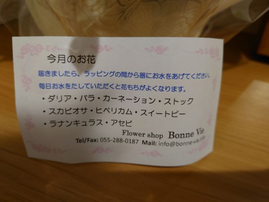 甲府市にある生花店「Bonne Vie」の代表であり「日本フラワーデザイン大賞2017」にて最高賞の内閣総理大臣賞を受賞他、数々のコンテストで受賞歴を持つ小松弘典が手がける季節を感じる旬のフラワーアレンジメントです。季節のお花や色合いで作るフラワーアレンジメントは、お部屋や玄関にも飾りやすく可愛らしいサイズ。店名の「Bonne Vie]は、フランス語で「良い生活、良い人生」・・・お花を通じてそんな気持ちを感じてほしいと想ってつけました。ご自宅にお花を飾り花のある素敵な暮らしを楽しんでみてはいかがでしょうか。