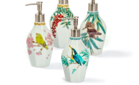 石川県の伝統工芸品である九谷焼のソープディスペンサーです。九谷焼の特長である色鮮やかな上絵付で日本の四季を表現しました。写生を元にした繊細な図柄は工房の独自の調合の上絵具で描かれています。実用品でありながら美術品の存在感があり、無機質になりがちなサニタリースペースが上質で温かみのある空間に変わります。
