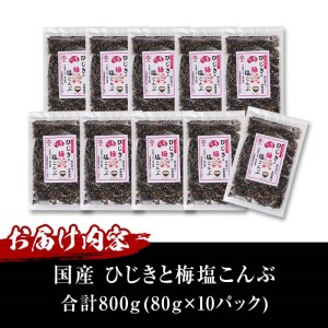 国産 ひじきと梅塩こんぶ (計800g・80g×10P) ひじき 梅塩 梅 こんぶ 昆布 ごはん おにぎり お茶漬け 常温 大分県 佐伯市【DE06】【安部水産 (株)】