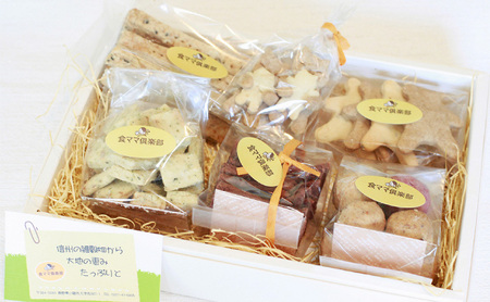 信州地粉、こもろブランドの雑穀、菜種油などの地元材料を使用。素材を生かして焼き上げたビスコッティやクッキー、グラノーラなど、おすすめお菓子を食ママが詰め合わせます。何が入っているかはお楽しみ♪