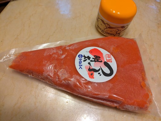 すけとうだらの卵(米国又はロシア)、醸造調味料、水あめ、食塩、果糖ぶどう糖液糖、唐辛子、でんぷん/調味料(アミノ酸等)、増粘剤(加工澱粉、増粘多糖類)、酸化防止剤(ビタミンC)、着色料(赤40、黄5)、発色剤(亜硝酸Na)、酵素、(一部に小麦、大豆、ゼラチンを含む)