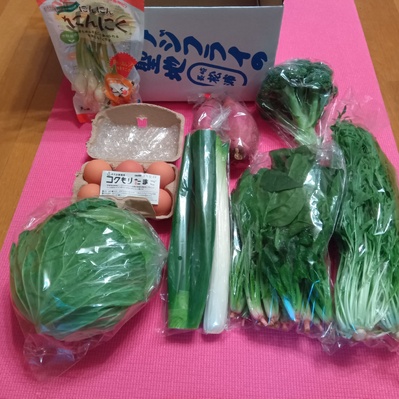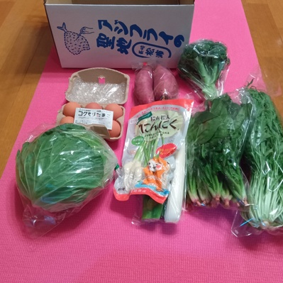 野菜と卵の詰め合わせです。野菜はネギ、ピーマン、しょうが、サツマイモが入っていました。量は予想通りでした。どれも新鮮で、大変美味しくいただきました。卵は黄身がしっかりしていておいしかったです。これからも続いて欲しいです。