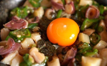 (2) 酢飯、又は白米にきざみのり、漁師飯の具、卵黄、白ごまをお好みで載せて出来上がり。