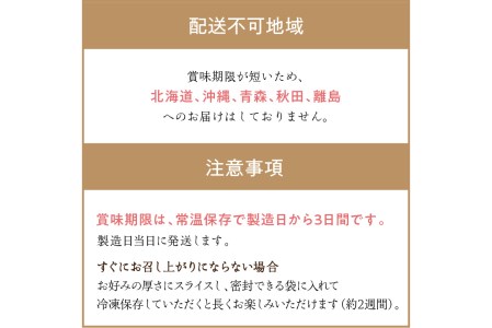 製造日当日に発送します。すぐにお召し上がりにならない場合は、お好みの厚さにスライスし、密封できる袋に入れて冷凍保存していただくと長くお楽しみいただけます(約2週間)。