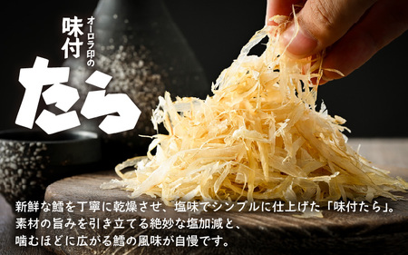 新鮮な鱈を丁寧に乾燥させ、薄くスライスして塩味で仕上げた「オーロラ印 味付たら」。