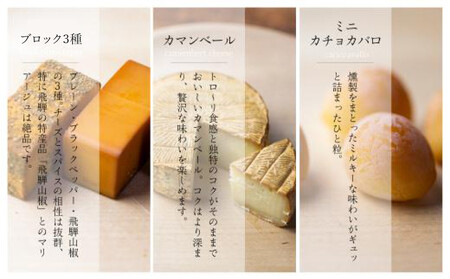 3種のフレーバー(プレーン、ブラックペッパー、飛騨山椒)を楽しめるプロセスチーズのブロックタイプ。温度に気を配り、時間をかけてじっくり燻しました。
