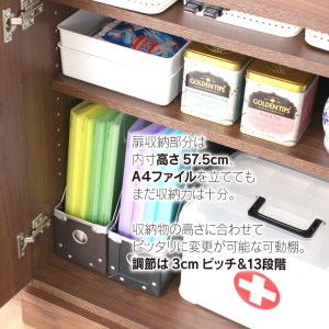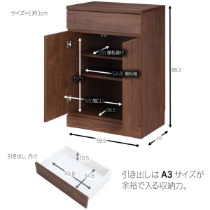 可動棚2枚がついた収納庫に、A3サイズがすっぽり入る引出し付きで、コンパクトでも十分な収納力。