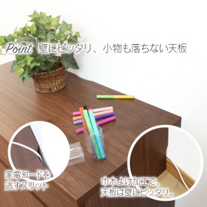 天板の背面側には家電のコードをさりげなく逃がすスリットを設け、側板は壁面にぴったり設置できる巾木よけ付き。