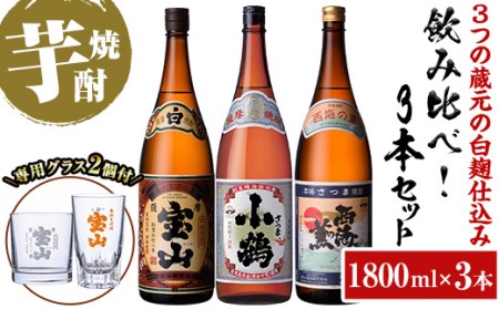 No.995 <数量限定>白麹仕込み!芋焼酎飲み比べ3本セット「薩摩宝山」「小鶴」「西海の薫」(1800ml×3本)専用グラス付き!酒 芋 焼酎 米麹 さつま芋 国産米 アルコール 飲み比べ セット【宮下酒店】