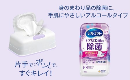「ヒアルロン酸配合 除菌」はアルコールタイプの手肌にやさしいウェットティッシュです。保湿成分ヒアルロン酸を配合。手肌にやさしく、身のまわり品の除菌ができます。お食事前のひと拭きにもピッタリです。