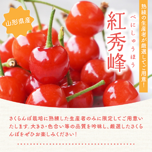 熟練した生産者が丹精込めて育て上げ、品質をしっかり吟味し厳選された「紅秀峰」をお届けします。紅秀峰は山形が誇る人気品種で、佐藤錦にも劣らない甘さとジューシーな果肉が特徴です。濃い赤色の美しい果実が食卓を華やかに彩ります。大粒でしっかりした食感と、高い糖度が生む贅沢な味わいを、ぜひご賞味ください。