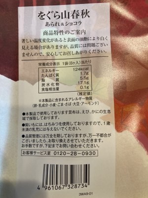 ショコラとお煎餅の相性が意外といいなと感じました。しょっぱきものと甘いもの両方が一度に食べれて食べ応えもあります。ショコラの方はスイーツとして楽しめる美味しさです。申込ページにカロリーと原材料が書いてなく気になりましたので、写真を添付しておきます。