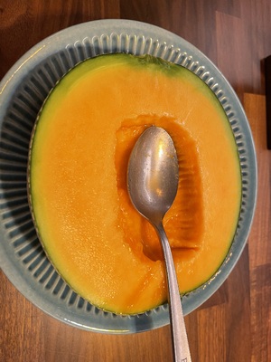 北海道の赤肉メロンは好きなので、いろいろな産地のものを試しています。7月の下旬ころに届けていただきました。最初に食べたほうはまだ硬かったので、2個目はしばらく置いてから食べることにしました。2玉だと便利です。