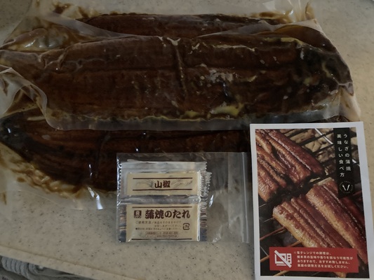 大きさの違ううなぎをもう一度頼みましたがこちらが先にきました、とにかく大きいです。 家族3人で分けても充分でした、タレと山椒もついてて、グリルでカリッと焼いてからタレを絡ませてとても美味しくいただきました、ありがとうございます。