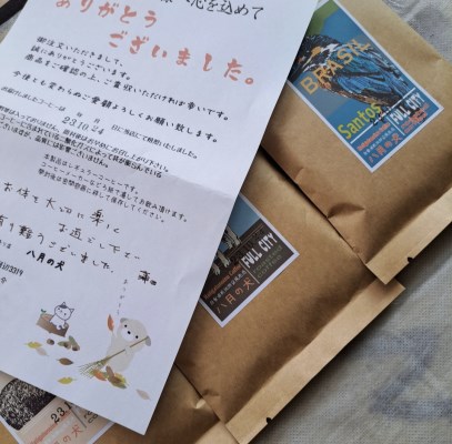 焙煎したての薫り高いコーヒーが届きました。 焙煎して間もないこともあり、市販のコーヒーではなかなか出会うことがない薫りが大変良く、味わいもとても良かったです。 お客様に「美味しいコーヒーだね」と褒められました。 送付状も温かい感じがして、なごみました。
