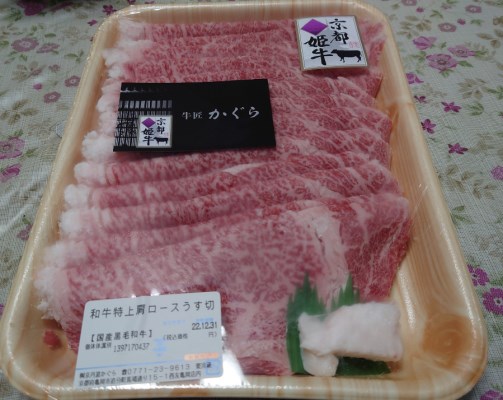 初めて、食べましたが、京丹波姫牛は大変美味しいお肉です。うちの家族はすき焼きが大好きなんですが、今は家内と二人暮らしなので、なかなかすき焼きをすることはありませんが、このローススライスは煮ても焼いても本当に美味いです。