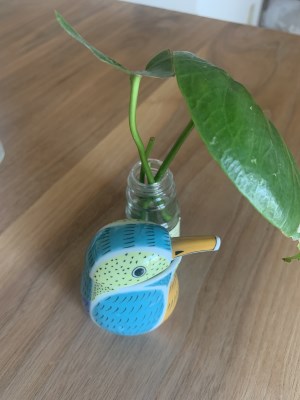 キッチンに飾っておくだけでもかわいいです。来客があるときに醤油さしとして出します。普段はおっくうになりがちですが、これだけでテーブルセットが華やぎます。お皿はシンプルなもので揃えているので、小物はちょっと変わったものがよいようです。