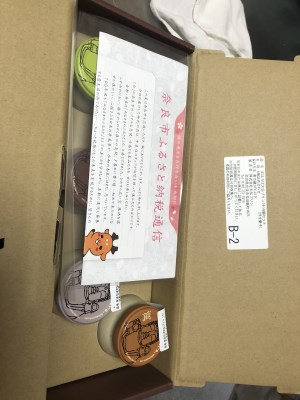 昨年奈良に旅行した際に 大仏プリンの美味しさと 可愛いパッケージが気に入ったので 注文しました。 大好きな奈良に寄付出来て、 奈良市民の仲間入り出来たようで 嬉しい気持ちです。 同封されていた奈良通信も 良かったです。 プリンは6種類ともビンの蓋の色が違って カラフルで子供も大喜びでした。 毎日違う味を楽しめ、 大満足でした。