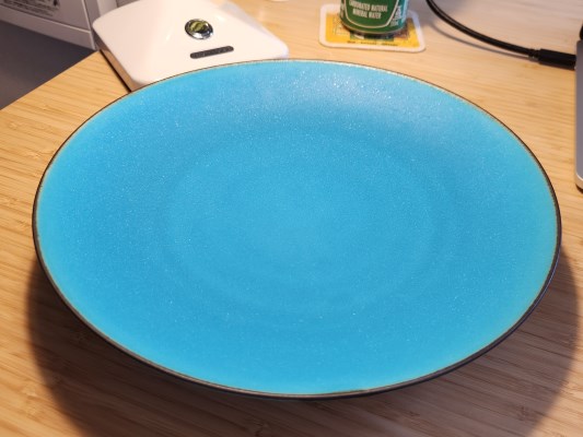 ターコイズブルーの美しいお皿を2枚いただきました。お皿の色合いは鮮やかで、何を盛り付けても映えます。 取り扱い説明書によると、この色のお皿は油分を吸収しやすい特性があり、使うほどに色味が落ち着きヴィンテージ品のような風合いに変化するとのことです。これからどのように変わっていくのか、とても楽しみです。