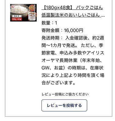 納税後、2週間ほどで返礼品が届きました。 コメ不足で値上がりもしている中、このパックご飯は割安で手軽です。 お昼にちょっとご飯を食べたいとき、1人前だけ足りないなんて時に すぐに使えるので重宝しています。 味も問題なくおいしいです。