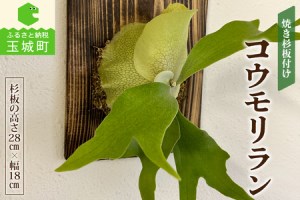 焼き杉板に付けたコウモリラン(ビカクシダ)、お部屋の壁に吊すとおしゃれな空間が生まれます。