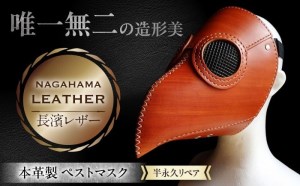 長浜の伝統的な「べんがら」と柿渋で塗装された、唯一無二の「長濱レザー」を使用。職人が一つひとつ手作業で木目模様を描き出した、アート作品のようなペストマスクです。