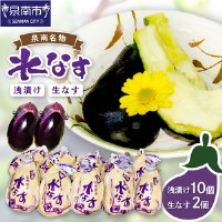 朝採りの新鮮な水なすを使用し、店主が一つ一つ丁寧に漬け込んだ泉州特産の水なすの浅漬けに生なす2個入りです。保存料・着色料は一切使用しておりません!