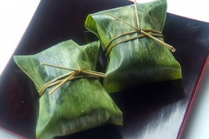 雲南市産のもち米を自家製のだしで炊き込み、うなぎ、しまね和牛肉をのせて、ひとつひとつ熊笹の葉に包んだ手作りのおにぎりです。
