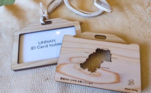 雲南産のヒノキと雲南市で処分されるイノシシの皮を利活用した雲南市の地域資源を活用した品です。