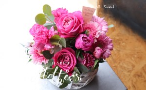 「母の日ギフト」八女のお花を使ったラウンドアレンジメント(ピンク)<配送不可:北海道・沖縄・離島>