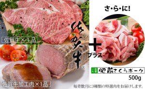 JA佐賀から全国の皆様にお届けする佐賀産ミートのプレミアム定期便です。その1,全国ブランド牛トップクラスに輝く「佐賀牛」の霜降りステーキまたはスライス肉を1セットです。霜降りの油脂さえ美味しい柔らかい佐賀牛の本場の味をお楽しみ下さい。その2,佐賀牛の赤身肉やミンチの部位を手間暇かけて仕上げた加工肉を1セット。佐賀牛をJAで加工したお肉はかなりのレア商品!ふるさと納税だらか味わえる逸品です。その3,佐賀のブランド豚「肥前さくらポーク」はピンク色の柔らかい肉質、使いやすいバラ肉、とんかつ、バラ焼肉をシーズンに合わせてお届け致します。