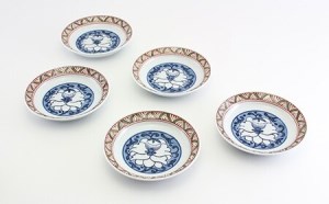 見込部分には染付で大胆に唐花文を描き、縁絵には赤と緑のリズミカルな地紋とのコントラストの対比が人気の銘々皿です。